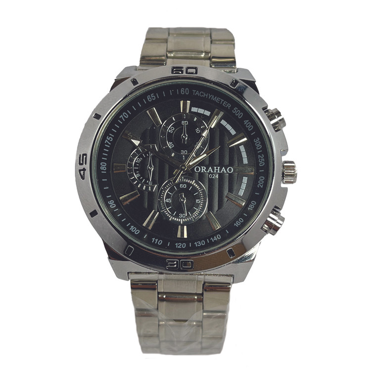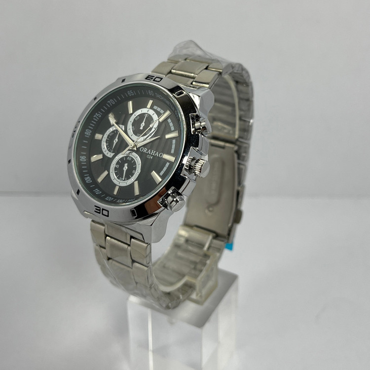 این مدل "ORAHO" با صفحه مشکی و طراحی اسپرت، انتخابی بینظیر برای آقایانیه که به استایل شیک و مدرن اهمیت میدن. قاب استیل نقرهای همراه با جزئیات دقیق و نشانگرهای ظریف، جلوهای خاص و حرفهای به این ساعت داده. ترکیب صفحه تیره و بند فلزی مقاوم، باعث شده این ساعت هم برای استفاده روزمره مناسب باشه و هم برای مناسبتهای خاص، جذابیت خودش رو حفظ کنه.