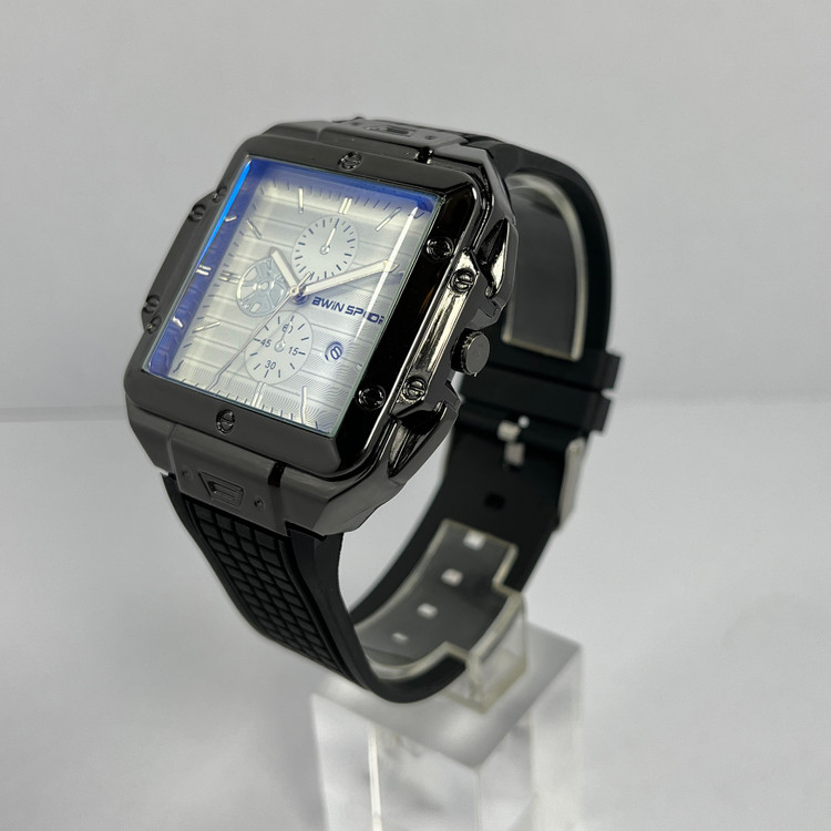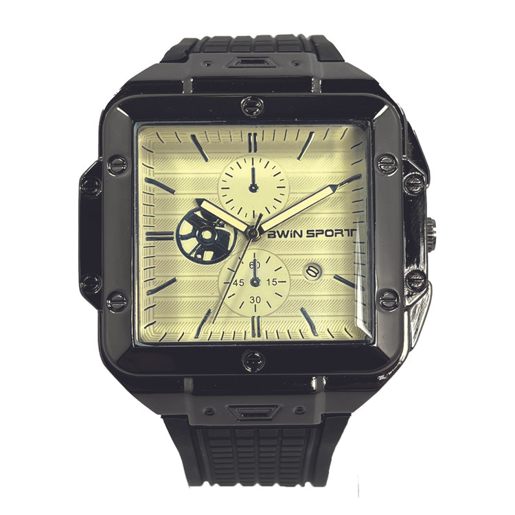 این مدل از ساعت AWIN SPORT با صفحه کرم رنگ و قاب مشکی براق، ترکیبی بسیار شیک و مدرن ارائه داده. طراحی مربعی قاب همراه با پیچهای ظریف روی بدنه، حس استحکام و لوکس بودن رو به زیبایی منتقل میکنه.