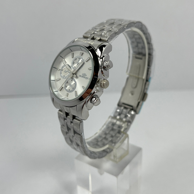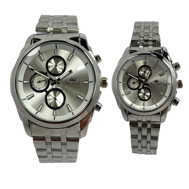 ست ساعت زنانه و مردانه الگانس مدل 657، با طراحی مینیمالیستی و رنگبندی متناسب، جلوهای کلاسیک و هماهنگ را ارائه میدهد. صفحه گرد با رنگ سیلور و بند استیل نقرهای، ترکیبی از سادگی و زیبایی را به نمایش میگذارد. این ساعت با طرح سه موتوره، ظاهری شیک و باوقار دارد که برای استفاده روزمره، مهمانیها و استایلهای رسمی مناسب است. قفل سه تکه دکمهدار، علاوه بر ایمنی، راحتی استفاده را نیز فراهم میآورد.